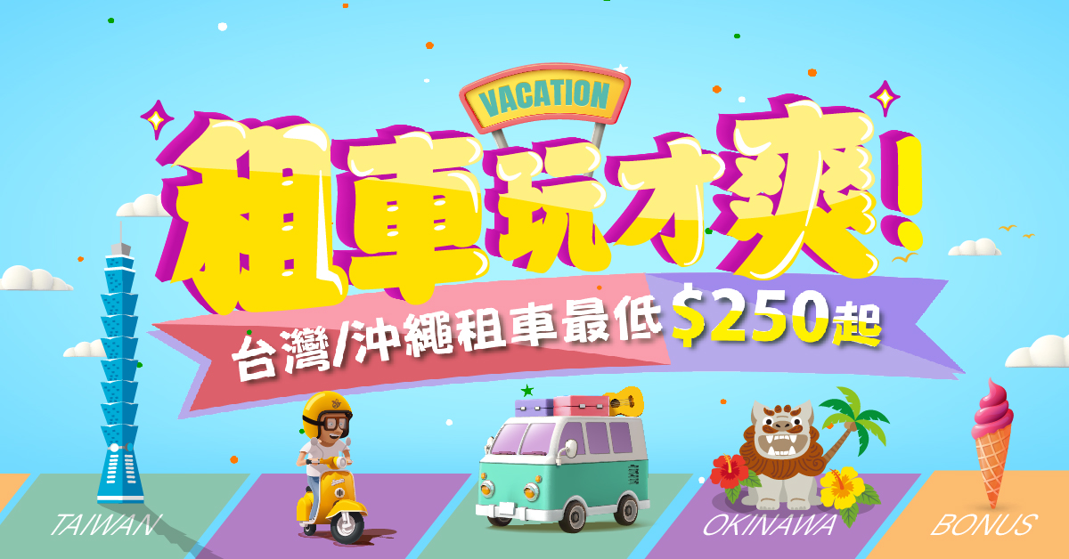 - description台灣、沖繩最新租車優惠這裡看!澎湖、台東火車站、花蓮火車站、高鐵各站取還,機車/電動車/五座車/七到九座休旅車多種車款;沖繩租車當地中文服務最安心,再送機場免費接駁!