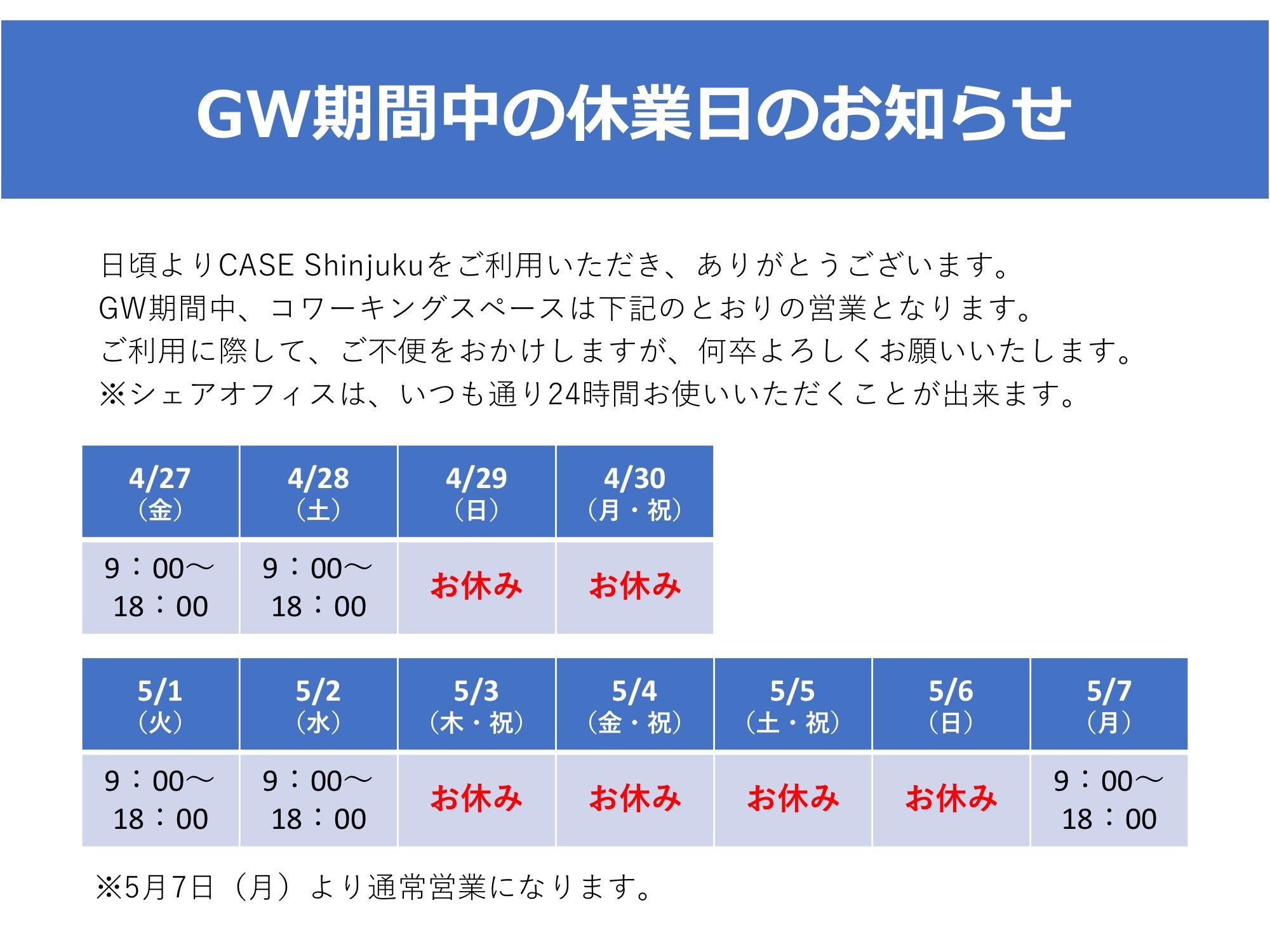 8- titleゴールデンウィーク中の休業日のお知らせ – CASE Shinjuku | 新宿区高田馬場のシェアオフィス&コワーキングスペース