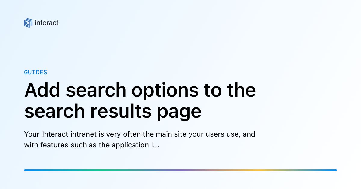 - twitter:imagehttps://cdn.readme.io/og-image/create?type=docs&title=Add%20search%20options%20to%20the%20search%20results%20page&projectTitle=Interact&description=Your%20Interact%20intranet%20is%20very%20often%20the%20main%20site%20your%20users%20use%2C%20and%20with%20features%20such%20as%20the%20application%20links%20bar%2C%20is%20often%20seen%20as%20a%20gateway%20or%20jumping%20off%20point%20to%20other%20systems.%20This%20is%20very%20true%20in%20the%20case%20of%20search.%20Interact%20has%20a%20number%20of%20integrations%20for%20search%20including%20Sharepoint%20and%E2%80%A6&logoUrl=https%3A%2F%2Ffiles.readme.io%2Fd7378ff564b0a3118ec8362a37199fbe290154cce595cb167c095773cf66ec78-small-Interact-Lockup-Horizontal.png&color=%23007AE0&variant=light