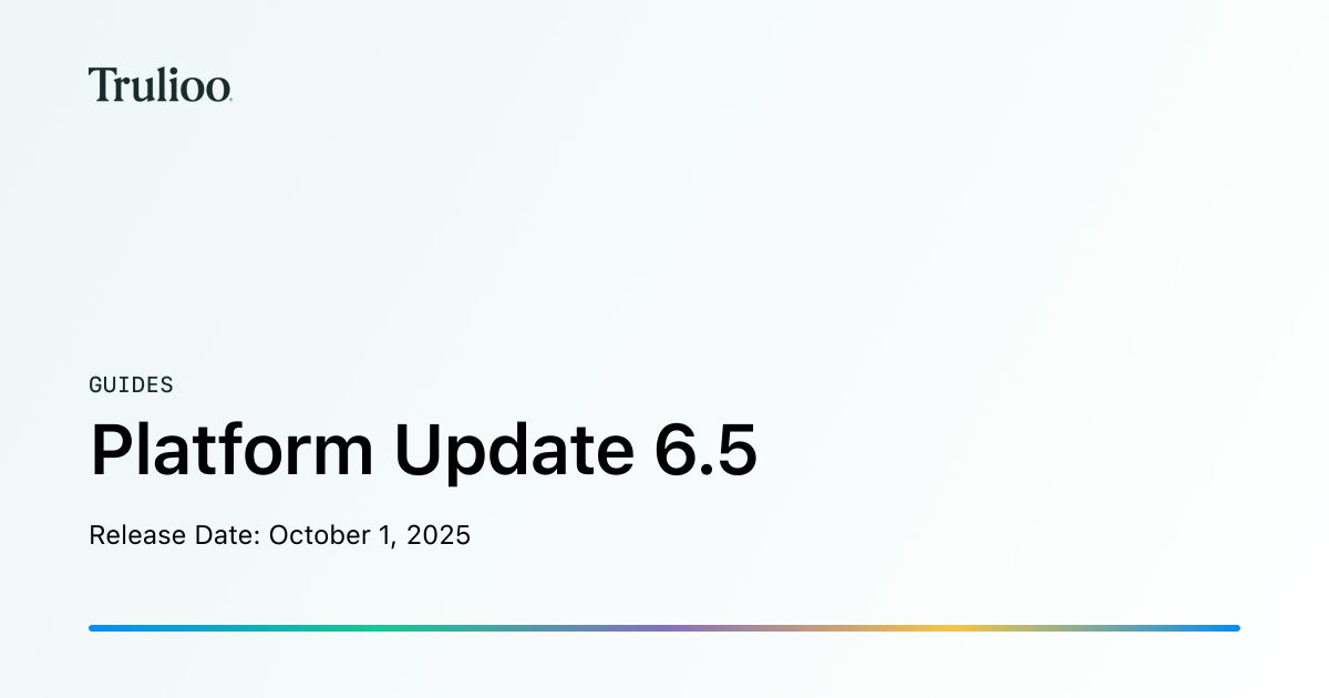 - twitter:imagehttps://cdn.readme.io/og-image/create?type=docs&title=Platform%20Update%206.5&projectTitle=Trulioo&description=Release%20Date%3A%20October%201%2C%202025&logoUrl=https%3A%2F%2Ffiles.readme.io%2F4dbb839-small-TLO_Dark_Green.png&color=%23172D2D&variant=light