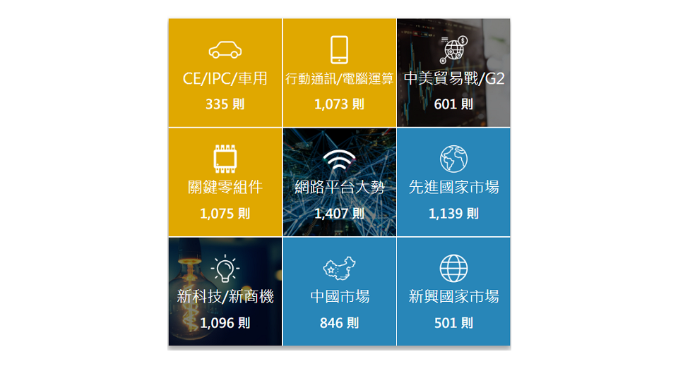 将ICT产业的观察角度切割成基本要素(九宫格中线)、供给面(左上角)、需求面(右下角)三大块,协助您掌握数据库关键信息。