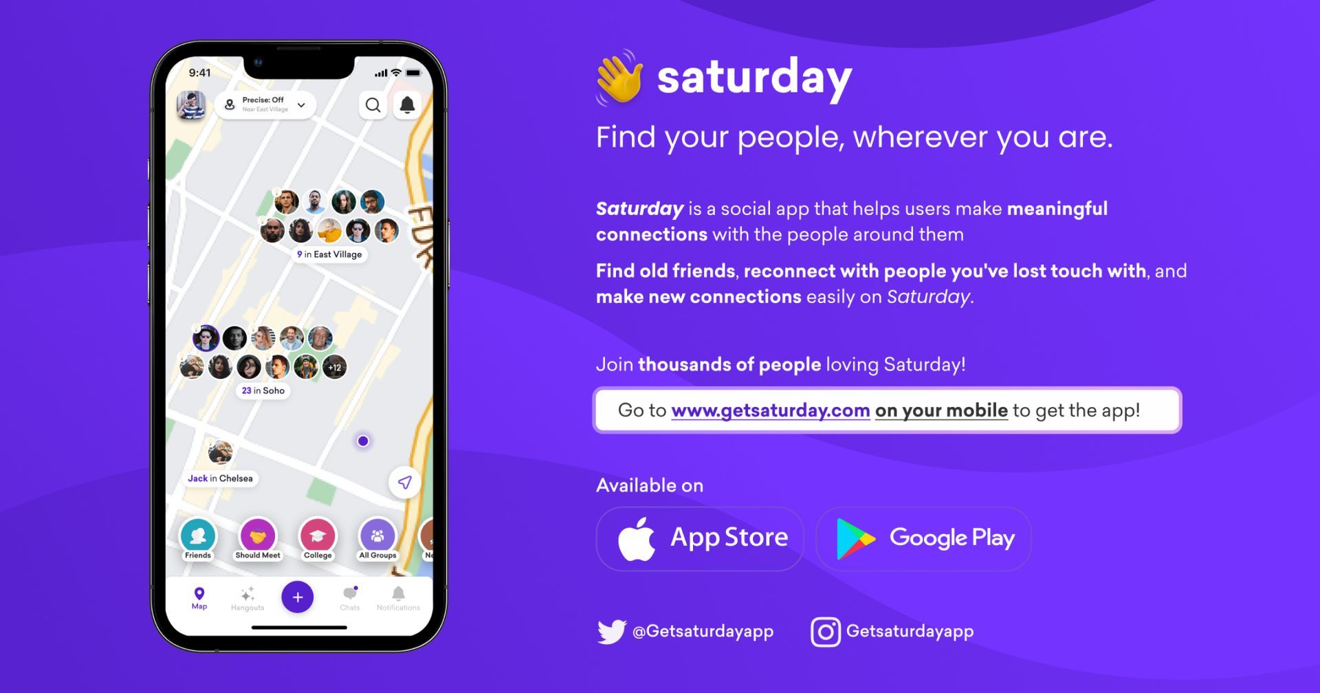 - twitter:descriptionSaturday is a social app that helps users make meaningful connections with the people around them. Find old friends, reconnect with people you've lost touch with, and make new connections easily on Saturday. Join thousands of people loving Saturday!