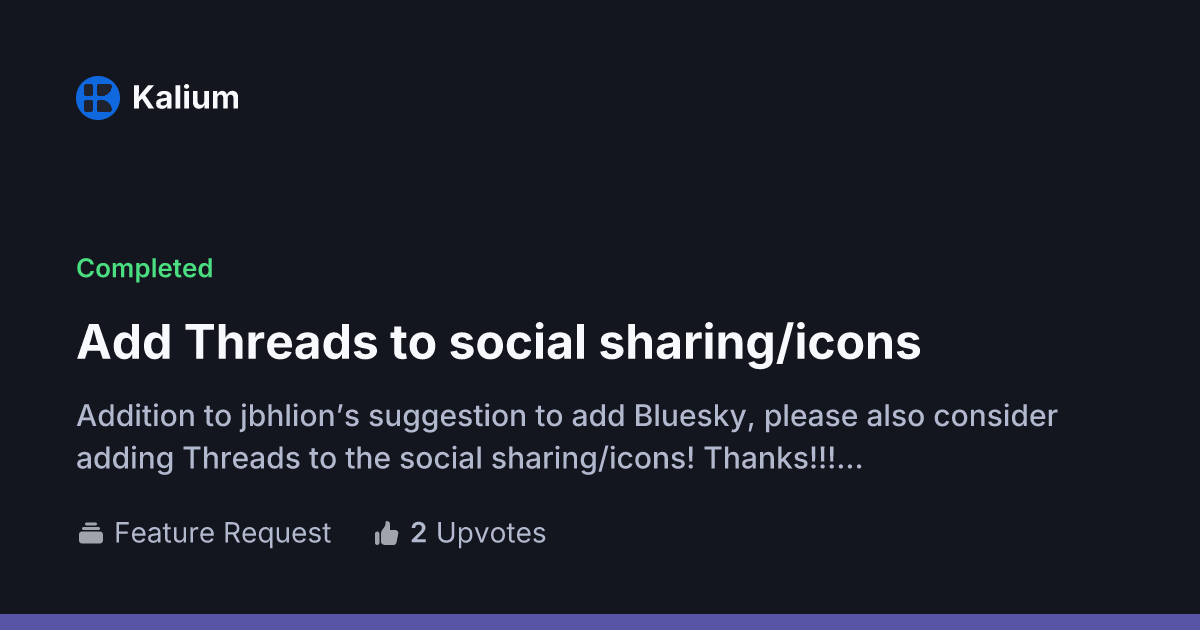 - og:imagehttps://og.featurebase.app/?type=post&title=Add+Threads+to+social+sharing%2Ficons&description=Addition+to+jbhlion%E2%80%99s+suggestion+to+add+Bluesky%2C+please+also+consider+adding+Threads+to+the+social+sharing%2Ficons%21+Thanks%21%21%21...&companyLogo=https%3A%2F%2Ffb-usercontent.fra1.cdn.digitaloceanspaces.com%2F0191ed3b-da36-7550-a968-b84e51071998.png&companyName=Kalium&companyThemeColor=%23857fff&companyTLP=bottom&statusText=Completed&statusColor=%234ade80&board=%F0%9F%92%A1+Feature+Request&upvotes=2&comments=0