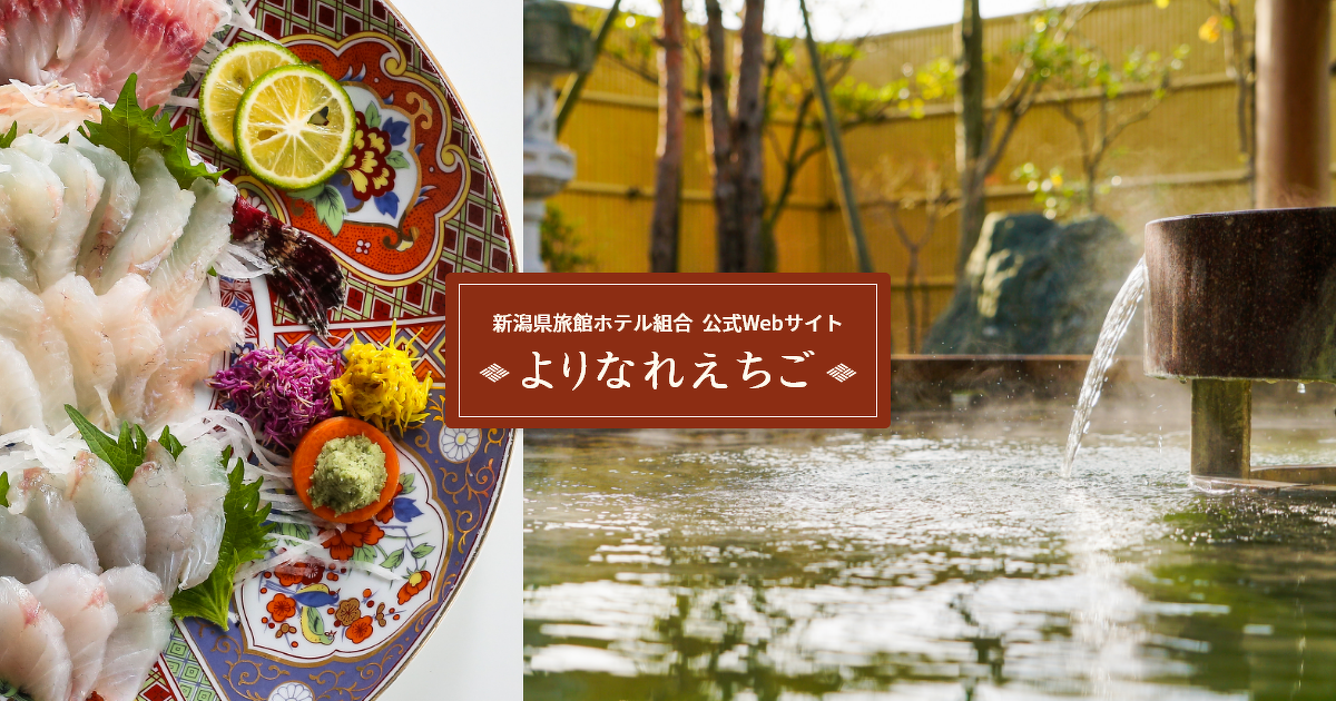 - og:description新潟県旅館ホテル組合の公式サイト「よりなれえちご」へようこそ。新潟県内の温泉宿・旅館・ホテルを検索できます。にいがた朝ごはん・にいがた地酒の宿・にいがたお宿の晩ごはんでは、各旅館・ホテルのキャンペーンサービスを紹介しています。