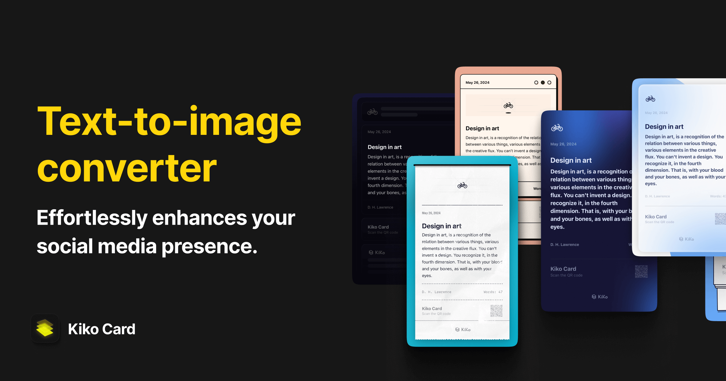 Kiko Card is a text-to-image converter, that effortlessly enhances your social media presence.